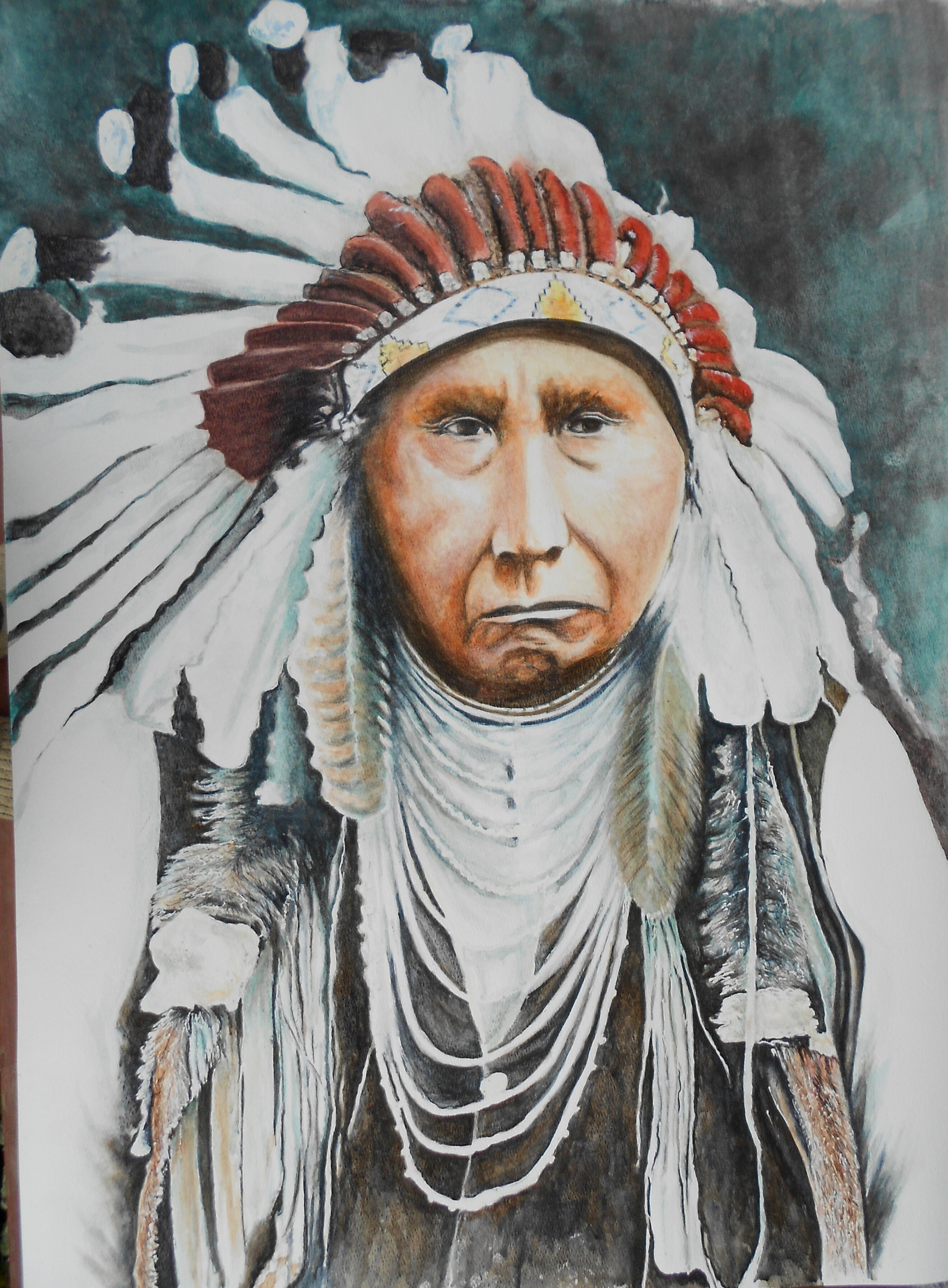 This watercolor painting is my tribute to Chief Joseph. As I worked, I let the colors be guided by the spirit I felt surrounding this remarkable leader—allowing intuition, rather than strict realism, to shape the tones in his face, the sweep of the feathers, and the quiet strength in his expression.My artistic philosophy is that art should serve as a bridge between the visible world and the deeper truths beneath it. With that in mind, I painted not just what I saw, but what I sensed: dignity, resilience, and a profound calm.The finished piece now resides in a resort on the shores of Lake Coeur d’Alene in Idaho—possibly near places this great chief once walked. I’m grateful knowing that the painting lives in a landscape connected to the history and spirit that inspired it.